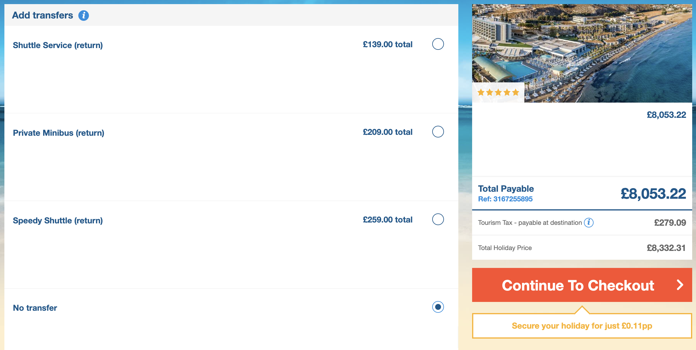 👉 Want to add transfers, travel insurance or any extras? You can do that here. You’ll also see your holiday summary on the right-hand side of the page.